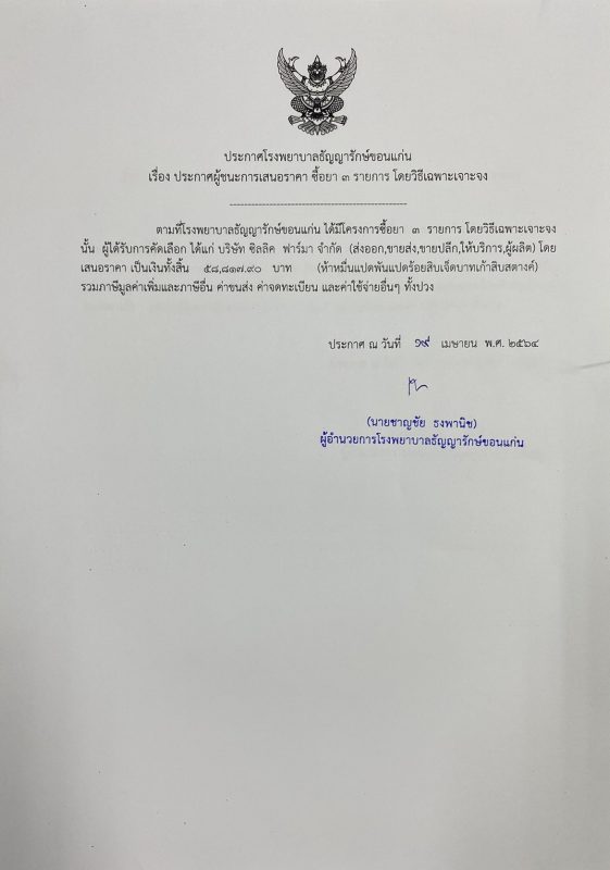 ประกาศผู้ชนะการเสนอราคา ซื้อยา๓ รายการ โดยวิธีเฉพาะเจาะจง