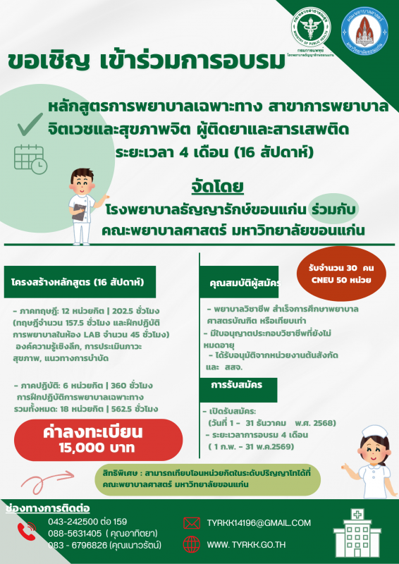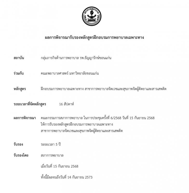 ข่าวประชาสัมพันธ์ ประชาสัมพันธ์หลักสูตรการพยาบาลเฉพาะทาง สาขาการพยาบาลจิตเวชและสุขภาพจิตผู้ติดยาและสารเสพติดระยะเวลา 4 เดือน หนังสือประชาสัมพันธ์เข้าร่วมอบรมหลักสูตร-การพยาบาล_251105_134538 FacebookFacebookLINELine ประกาศโรงพยาบาลธัญญารักษ์ขอนแก่น เรื่อง ประกาศผู้ชนะการเสนอราคา ซื้อประกันภัยรถยนต์ภาคบังคับ จำนวน ๗ คัน โดยวิธีเฉพาะเจาะจง ประกาศผู้ชนะการเสนอราคา จ้างเหมาซ่อมบำรุงครุภัณฑ์ยานพาหนะและขนส่ง รายการรถชีวนิรภัยพระราชทาน หมายเลขทะเบียน ๓ ฒก ๒๔๓๔ กรุงเทพมหานคร จำนวน ๑ คัน โดยวิธีเฉพาะเจาะจง