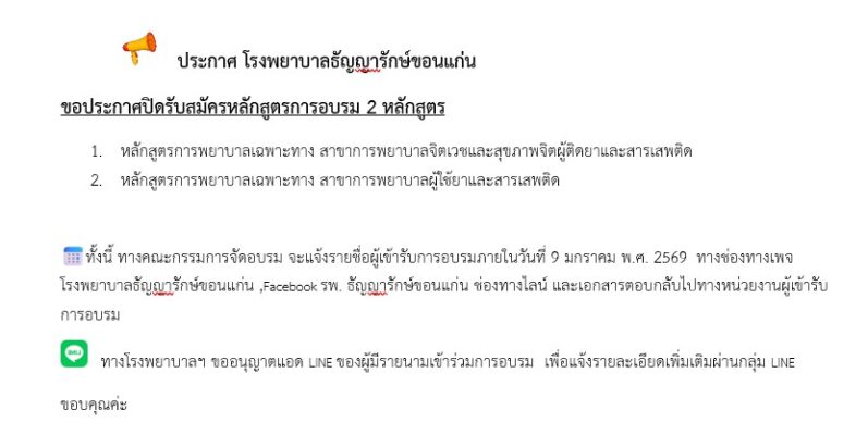 โรงพยาบาลธัญญารักษ์ขอนแก่นขอประกาศ ปิดรับสมัครการอบรม จำนวน 2 หลักสูตร ได้แก่