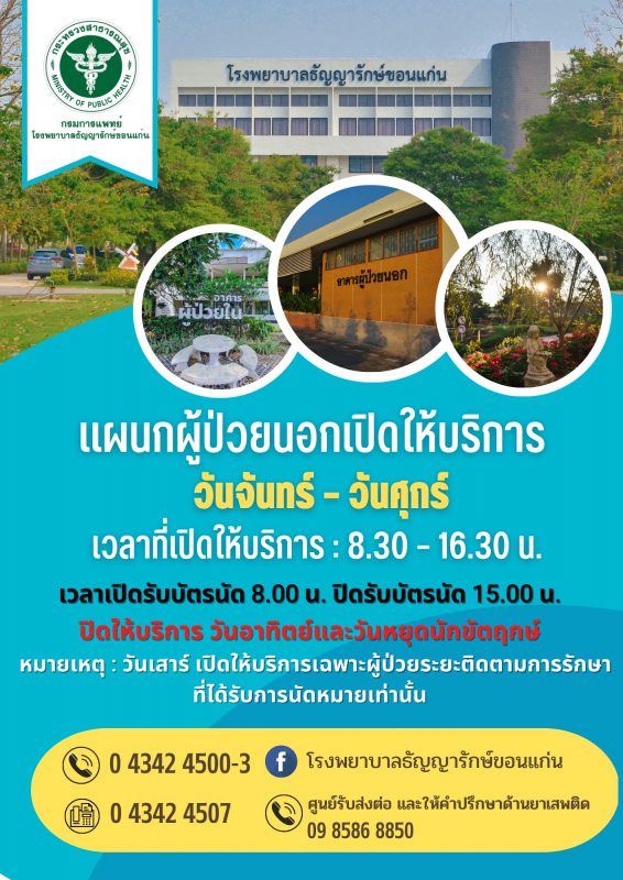 โรงพยาบาลธัญญารักษ์ขอนแก่น เลขที่ 775 หมู่ที่ 19 ถนน มะลิวัลย์ ตำบลศิลา อำเภอเมือง จังหวัดขอนแก่น 40000 เปิดให้บริการ: จันทร์-ศุกร์ เวลาทำการ: 08.30-16.30 น.
